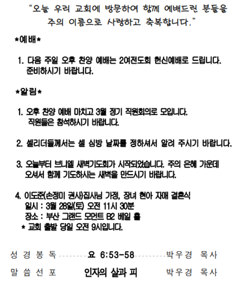 2026년 3월 8일 주일(광고, 주일 낮 설교)